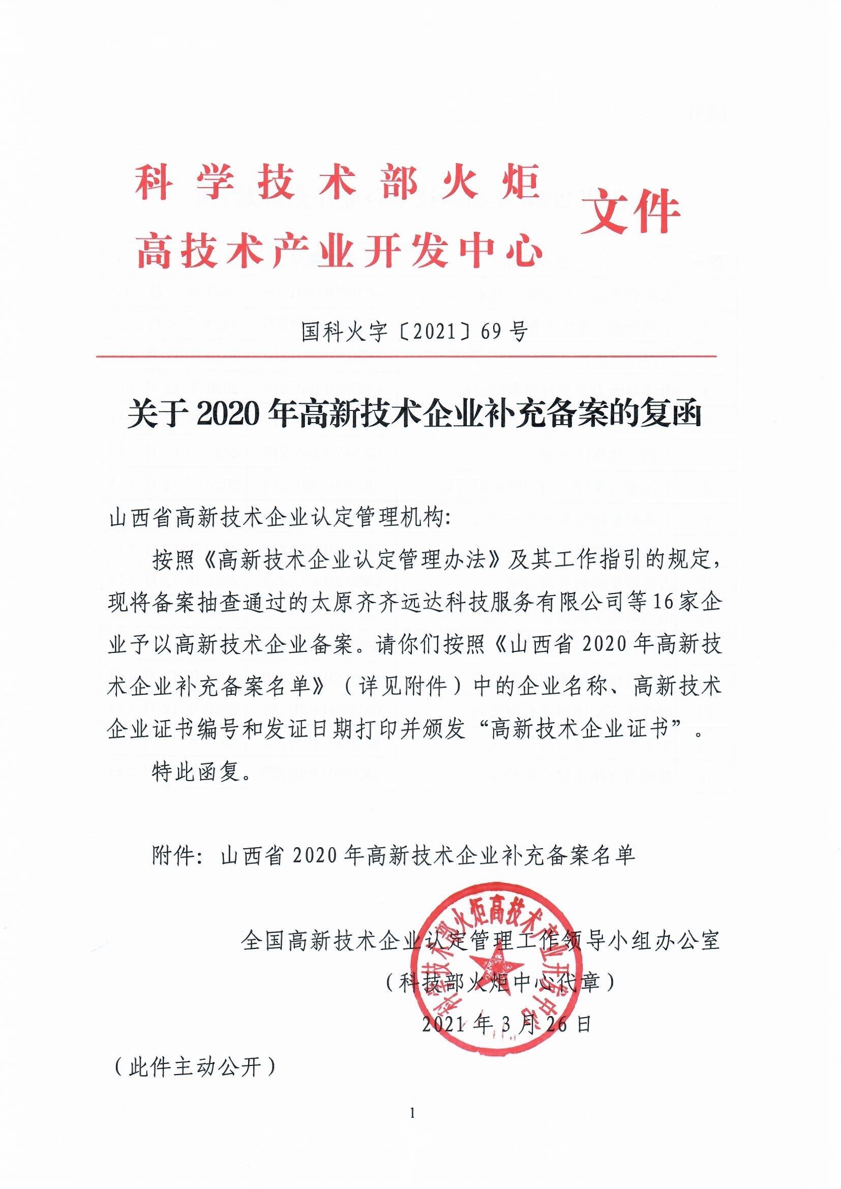 山西關(guān)于2020年高新技術(shù)企業(yè)補充備案的復(fù)函